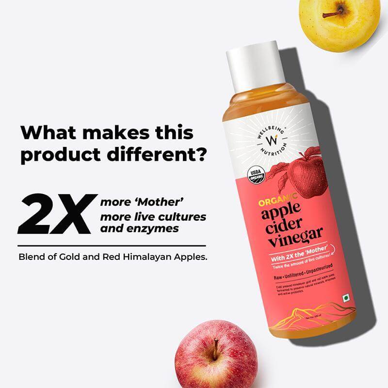 - Apple Cider Vinegar:- USDA Organic Apple Cider Vinegar "Made from Gold & Red Himalayan Apples with 2x More ‘Mother’ and Digestive Enzymes